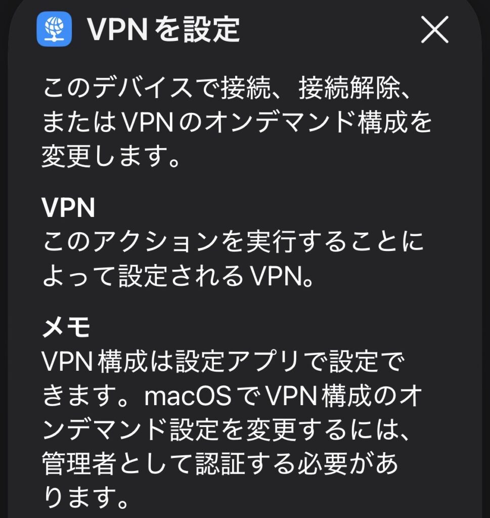 iPhoneに設定済みのVPNをオン、またはオフにするという処理を行います。