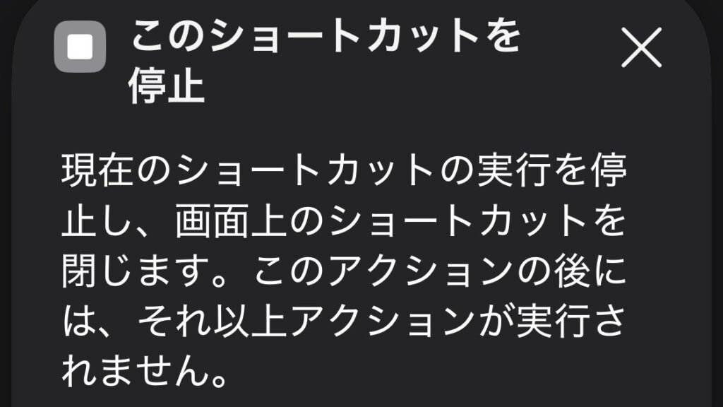 実行中のショートカットをその場で終了し、それ以降の処理を一切行わないようにするアクションです。